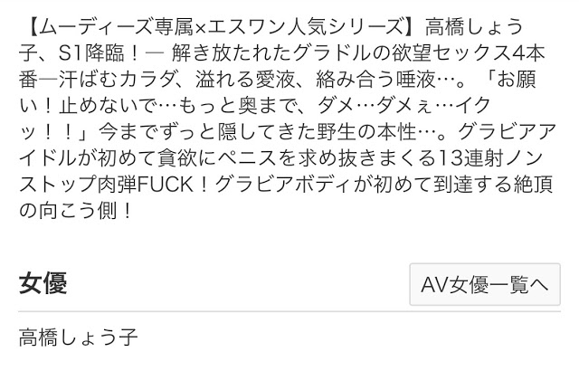 其实不用紧张也不用害怕S1会变成一家独大的超级邪恶帝国,因为这支作品发售的日期是12月1日、作品标题前面也特别标了「ムーディーズ専属×エスワン人気シリーズ」,所以很明显了,这是一个跨公司的合作,虽然发片的是S1、不过一切都还是配合公司Moodyz,不只发片的日期如此、标题更是注明了高桥しょう子(高桥圣子)的身分归属:
