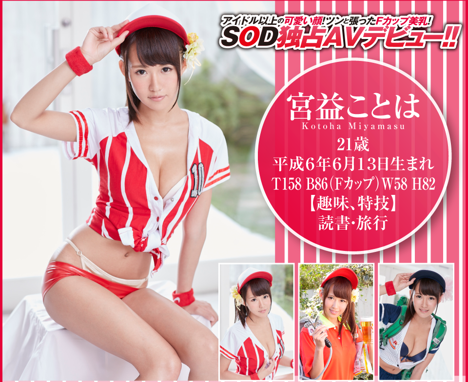 因为在2015年年底的时候,她是以在球场打工的啤酒妹身分在SOD集团MDTM-398兼差出道,那时候她用的艺名是宫益こ之は(宫益琴叶):知道她的身分就不会觉得宇宙企画的文案太夸张,因为那时候SOD集团也是吹很大,他们说这位宫益桑「脸蛋更胜偶像」、然后「身材好的让人想见面5秒就合体」,不看你就亏大了~