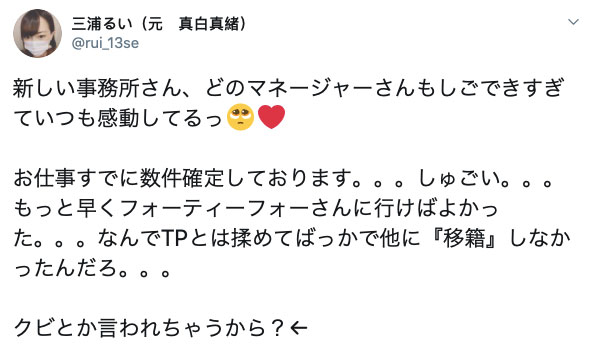 所以她一气之下就脱离了原先的经纪公司转投44 Group也改名为三浦るい(三浦瑠衣):记得刚改完名字后她不断称赞新东家「很有能力」,片约不断让她拍得很过瘾,但没多久她又把twitter给删了: