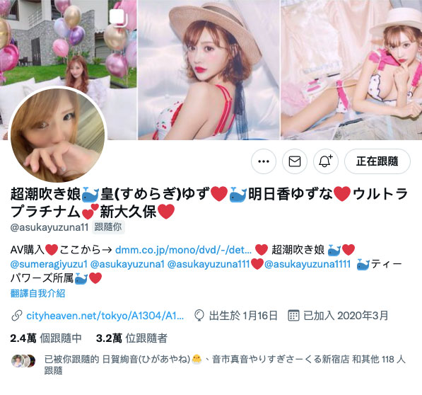 因为她在twitter已经混很久了ー没错,公司的文案完全没骗人,皇ゆず(皇柚子)的确是很多人追踪的风俗妹,只是之前她不叫皇ゆず(皇柚子)这个名字,而是“超喷水女皇”的明日香ゆずな(明日香柚奈):