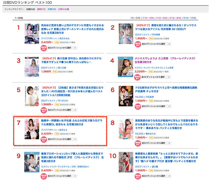 所以我就想问了,为什么ideapocket这次要省略让桜空もも(樱空桃)重返荣耀的关键字?是故意的还是不小心忘记了?不过看起来不提里出し对她的影响也不大,在昨天的销售排行榜上她又是IP社仅次于相沢みなみ(相泽南)的销售好手: