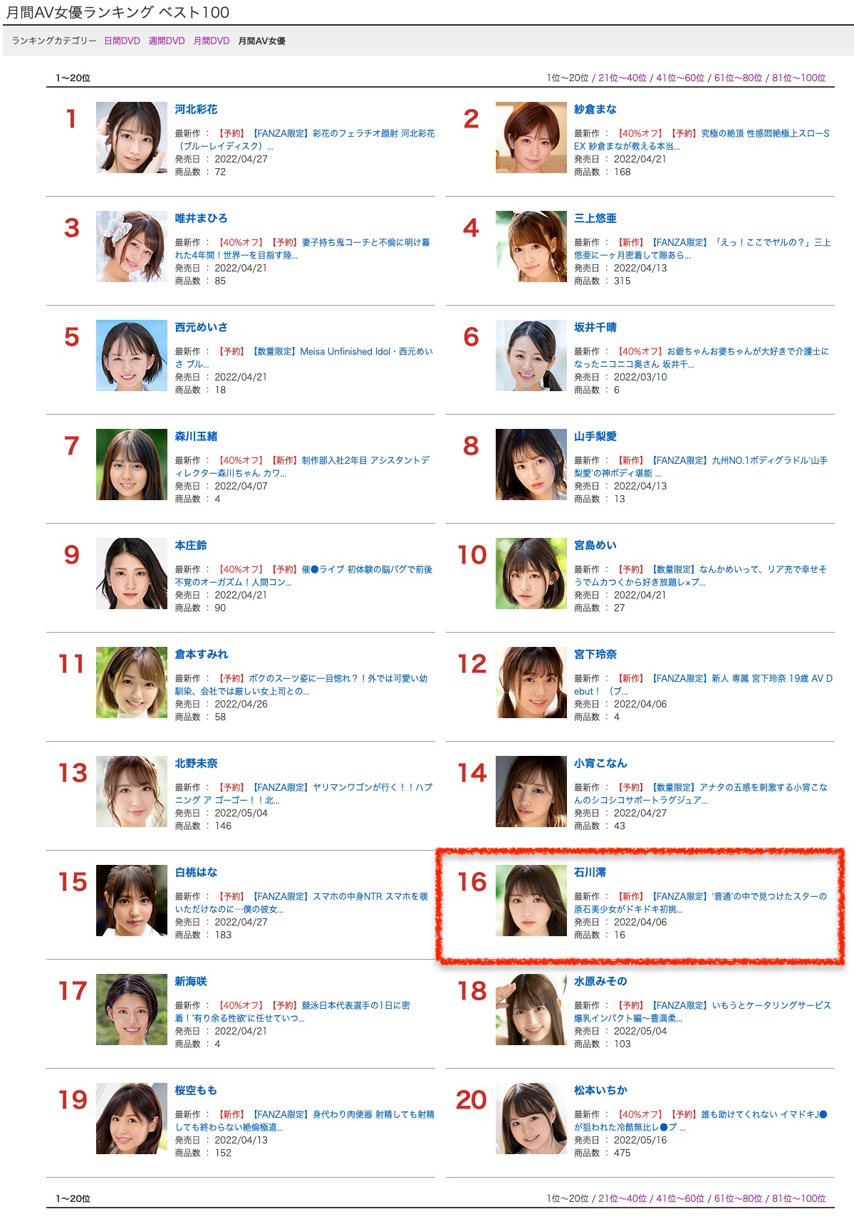 所以大家应该看懂了,除了强调口爱技巧外,这还是一支学生服的Cosplay演出,将石川澪的优势放大到极限;虽然比不上两位老前辈的引退作,但在FANZA的周排行榜她也取得相当不错的成绩:
