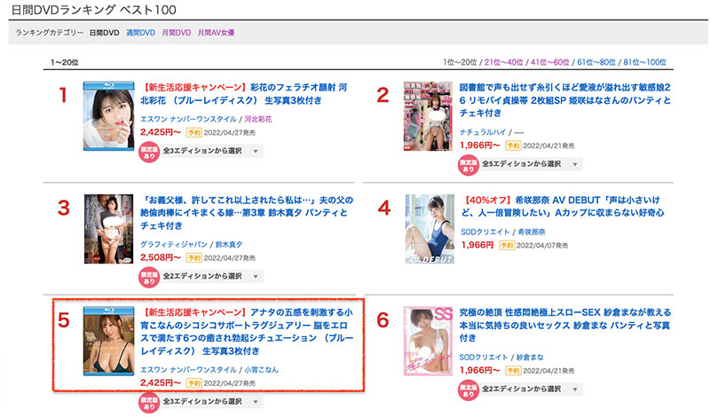 之前都是有“恋球”之称的鹫尾めい(鹫尾芽衣),但这一次状况有点改变,从作品上架接受预约到现在,河北彩花仍然是不动的王者,但S1在她之后的人有变,都是由小宵こなん(小宵虎南)稳坐第二名的位置: