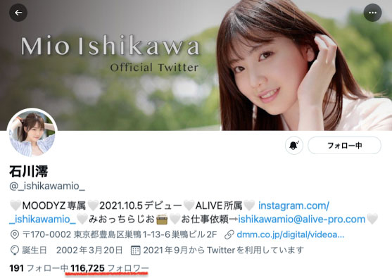 超过什么?自然是暗黑界两大新星的社群追逐战,是谁很会搞社群呢?扣掉在TikTok自带340万(现在又更多了)的超级网红うんぱい(Unpai),一个是天然美少女“石川澪”、另一个则是新一代的身材教科书“山手梨爱”,两人深谙圈粉之道,但山手梨爱比想像中跑得更快,不到五个月已经有12.2万粉丝,超越石川澪的11.6万,真的太强了⋯
