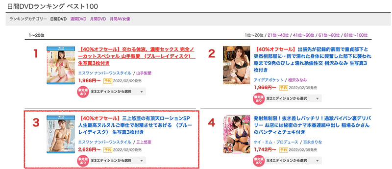 虽然三上换上了连身泳装等打扮,让润滑油浇下去可以凸显她愈来愈魔鬼的身材,不过这仍然是一支很偏癖好类的作品ー而从昨天的日间排名来看,三上还是三上,不管是什么样的企划她都能交出稳定的成绩(赢她的前两名一个是超级新人一个是日间榜的魔鬼),只要今明两天不要排名暴跌,以这一行“前三天决定卖得好不好”的惯例就代表这支作品销售过关了: