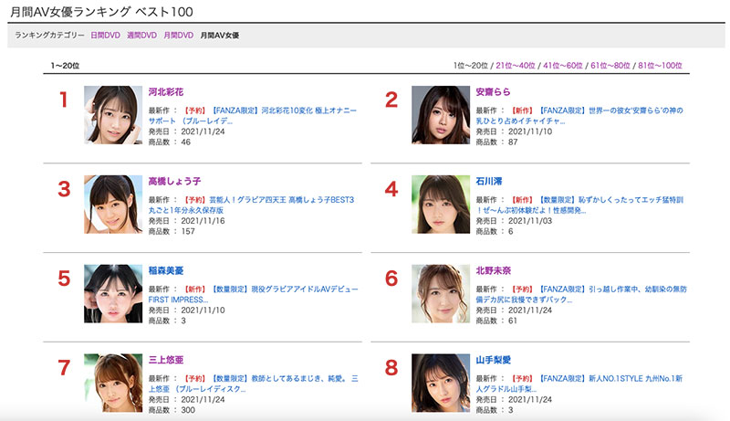 只是调动三上悠亜实在让人蛮惊讶的,以上个月的销售排名来看,三上一共有3支作品进入百大,排名分别是21、77、98(两支是这个月预约的片子,一支是上个月已经发售的作品),累积销售量的排名则是第7,虽然没有作品打进前20名,但总销售量在S1也只输给了安斋らら(安斋拉拉)和河北彩花两位女星,结果S1竟然在2021年的最后一个月调整她的档期?