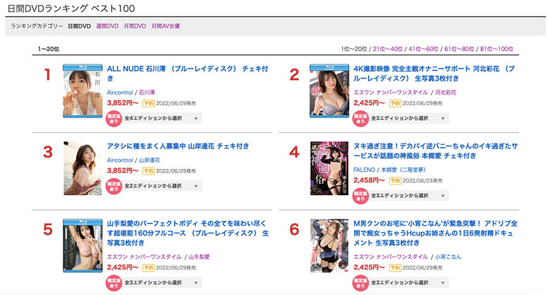 其实S1这一档最近几个月作品上架第一天的排名都一样,河北彩花最卖、山手梨爱次之、接下来就是小宵こなん(小宵虎南),是,昨天有朋友留言说他更喜欢山手,看好她有一天会超越河北彩花,但至少到目前为止这件事还没有发生,不管是换档前、换档后、然后又一次换档,山手梨爱的威力虽强,但总是以些微的差距落后河北彩花⋯