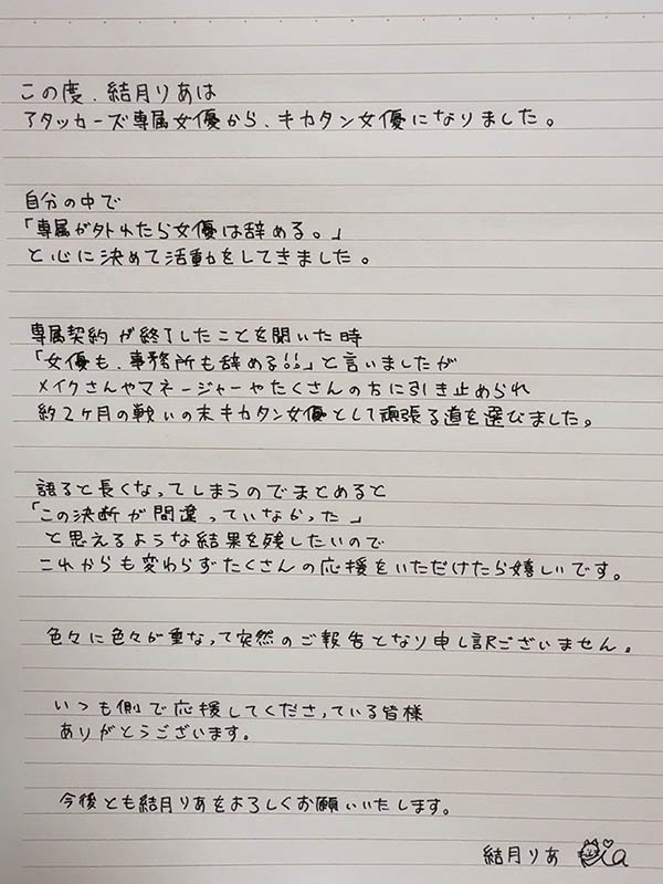 结月りあ(结月莉亚)说了,她的确离开了アタッカーズ(Attackers),现在是无专属的企划女星ー当得知自己契约到期没有获得续约的时候,结月りあ(结月莉亚)曾经认为既然没有公司要签专属了那不如就退休吧,不过在经纪人以及其他工作人员的劝说下,经过两个月的深思熟虑,最后结月りあ(结月莉亚)决定成为企划女星迎接各式各样的挑战,不要让自己后悔: