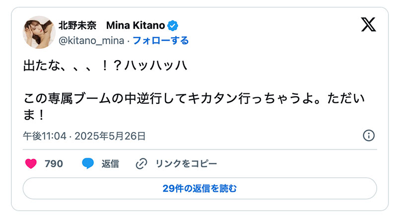 那不是「专属的」北野未奈该来的地方,果然,片子一出,北野未奈就在X()发文了: