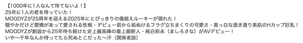 还记得我之前请大家去追踪的「纯白彩永」吗?今天,她正式掀开了神秘的面纱、以Moodyz专属女星的身分出道ー然后我要坦白说,我知道她很重要,但我不知道这位新人有这么重要,有多重要呢?我们一块来看看Moodyz的文案是怎么形容她的: