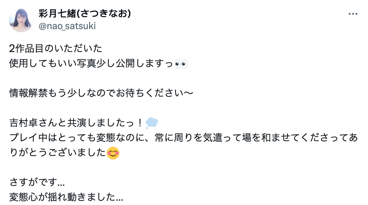 其实当时就有人把她的作品封面找出来了,不过这个「超大物新人」的形容词倒是有点意思,SOD Star是说彩月七緒(彩月七绪)和不久前刚出道的艺能人女星「矢埜愛茉(矢野爱茉)」有着超强资历还是形容她未来不可限量有成为暗黑天后的潜力,又或者,只是因为她胸部超・级・大?